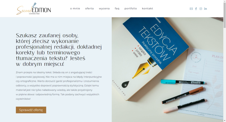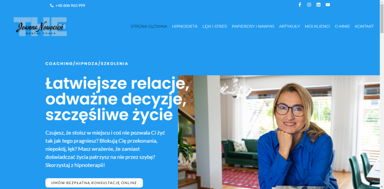 „Bardzo polecam współpracę z Julią! Po przesłaniu inspiracji Julia przygotowała profesjonalną ofertę z propozycjami kolorystyki, czcionki oraz struktury strony i podstron. To pozwoliło od razu wyobrazić sobie efekt końcowy. Współpraca przebiegała bardzo sprawnie i w przemiłej atmosferze. Julia w kilka dni zrobiła mi piękną stronę, uwzględniała wszystkie moje sugestie, poprawki i proponowała rozwiązania, o których ja nie miałam pojęcia. Pokazała mi jak samodzielnie wprowadzać drobne zmiany, ale jeśli z czymś sobie nie radzę to zawsze służy pomocą i działa NATYCHMIAST!! Serdecznie polecam!!!”